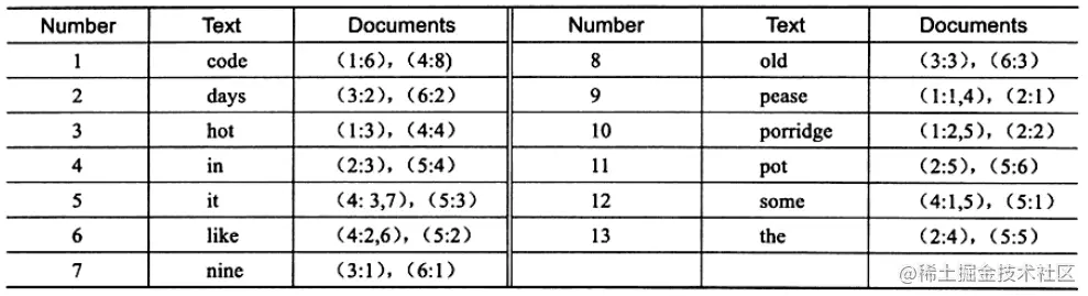 上图为 inverted file index 关联数组,可以看到其中单词"code"存在于文档1,4中,这样存储再进行全文查询就简单了,可以直接根据 Documents 得到包含查询关键字的文档;而 full inverted index 存储的是对,即(DocumentId,Position),因此其存储的倒排索引如下图,如关键字"code"存在于文档1的第6个单词和文档4的第8个单词。