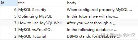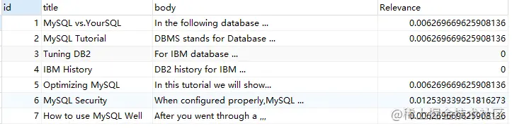 MATCH ( title, body ) against ( 'MySQL' ) AS Relevance