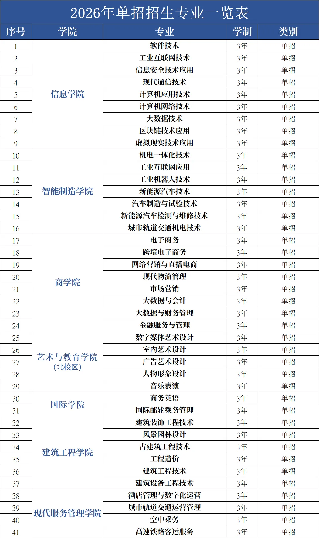 2026年学校单独考试招生专业及计划见附表,技能拔尖人才免试录取考生计划单列执行,学校可视报考情况,调整招生计划。