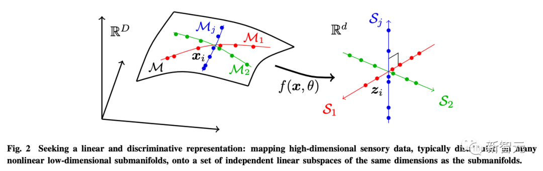 压缩:将高维感官数据x映射到低维表征z; 线性化:将分布在非线性子面的每一类物体映射到线性子空间; 稀疏化:将不同类别映射到相互独立或最不相关的子空间。