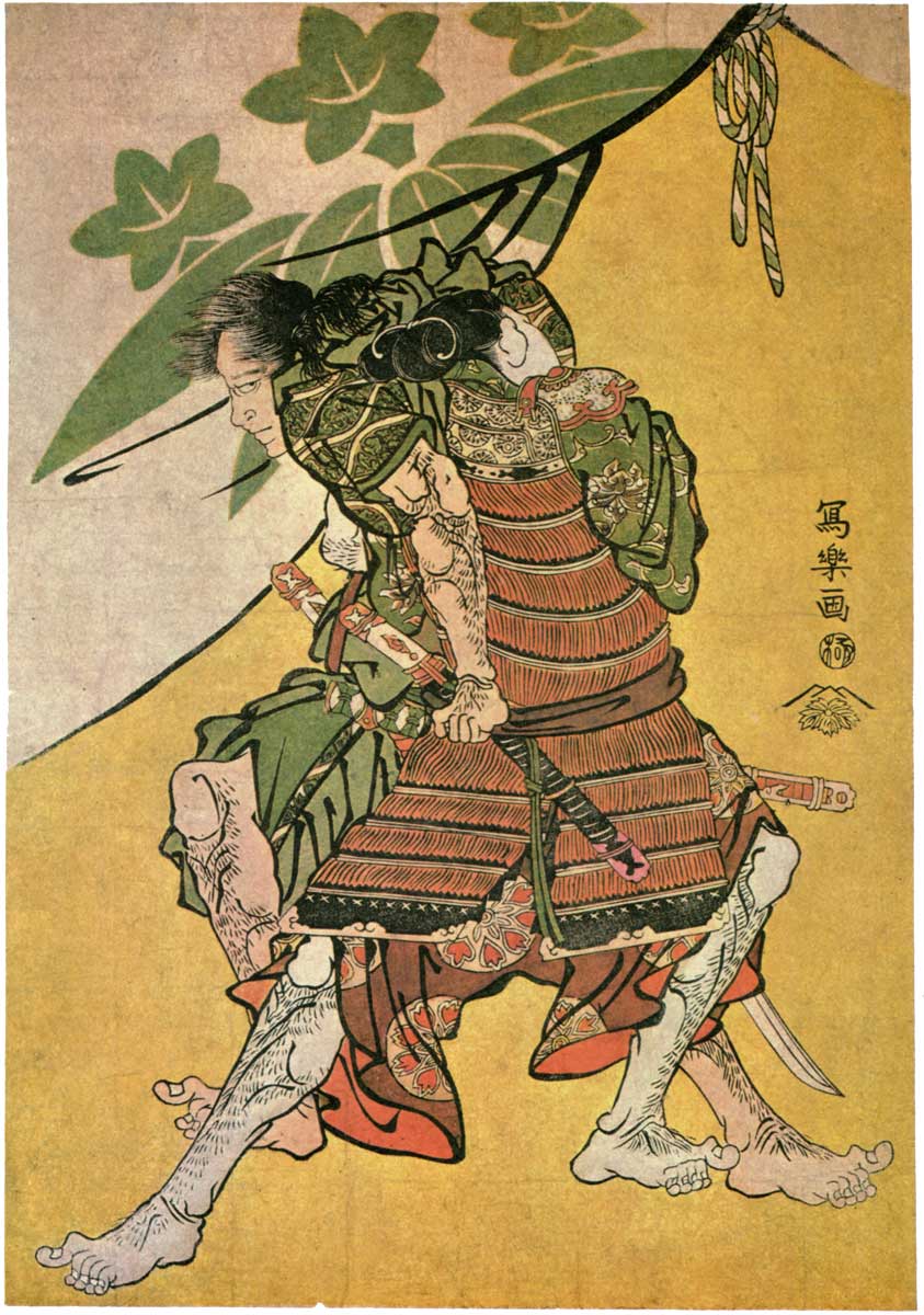 这幅画是江户时代神秘画家东洲斋写乐的作品,描绘的是当时关于曾我兄弟复仇事件的歌舞伎表演。曾我兄弟的父亲河津祐泰被工藤祐经误杀,然后他们的母亲改嫁曾我祐信,两兄弟在曾我家长大,所以后来称为曾我兄弟。他们元服之后分别改名曾我十郎祐成和曾我五郎时致。后来工藤祐经跟随源赖朝在富士山下狩猎,曾我兄弟趁人不备,潜入其中,将工藤祐经杀死,随后兄长曾我十郎祐成被赶来的武士所杀;弟弟五郎想潜入源赖朝的寝所,结果被男扮女装的御所五郎丸擒获。后来这个故事在江户时代被改编为多种作品,尤其是在歌舞伎中是一个流行题材,被称为『曾我物語』。画面中五郎身穿绿色薄衣,头发飘动,眼神怪异,被身后的五郎丸抱住了腰;五郎丸身穿解了袖子的红色胴铠,白净的侧脸与女性化的发髻说明他当时的男扮女装身份,与传奇故事中的描述相同;金黄的背景与斜拉着的帷幔让二人争斗的场景更添一丝紧迫感。