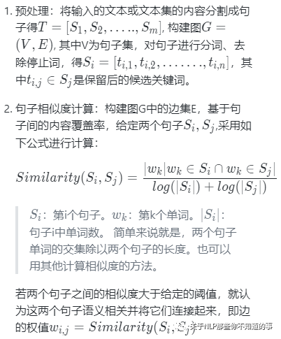 简单来说,将句子看作结点,句子之间的相似度看作边,构建图,然后用类似PageRank的算法迭代得到每个句子的得分,最终将得分高的句子输出得到摘要。