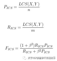 其中LCS(X,Y)是X和Y的最长公共子序列的长度,m,n分别表示参考摘要和待审摘要的长度(一般就是所含词的个数)。R和P分别表示召回率和精确率,F即是Rouge-L。一般只考虑召回率,所以参数会被设置为一个很大的数。