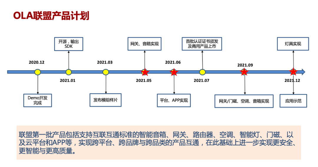 之后,基于OLA联盟互联互通标准的第一批产品,包括智能音箱、网关、路由器、空调、智能灯、门磁、以及云平台和APP等,将实现跨平台、跨品牌与跨品类的产品互通,并在此基础上进一步实现更安全、更智能与更高质量。